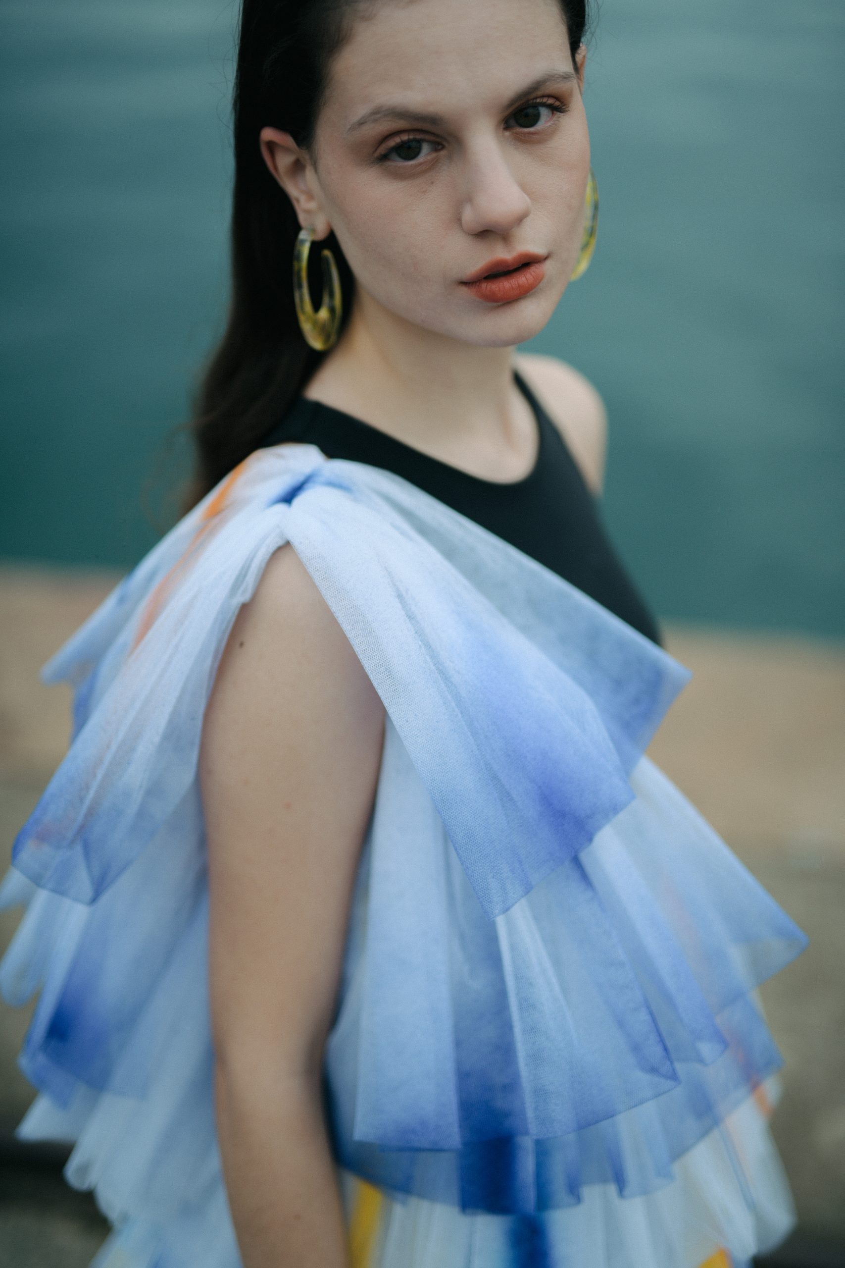 Vestido largo de tul con un diseño asimétrico que deja al descubierto la mitad del cuerpo, intervenido artísticamente con spray en tonos azules, naranjas y amarillos. Una fusión perfecta entre moda y arte, parte de la colección «Blank Madness».