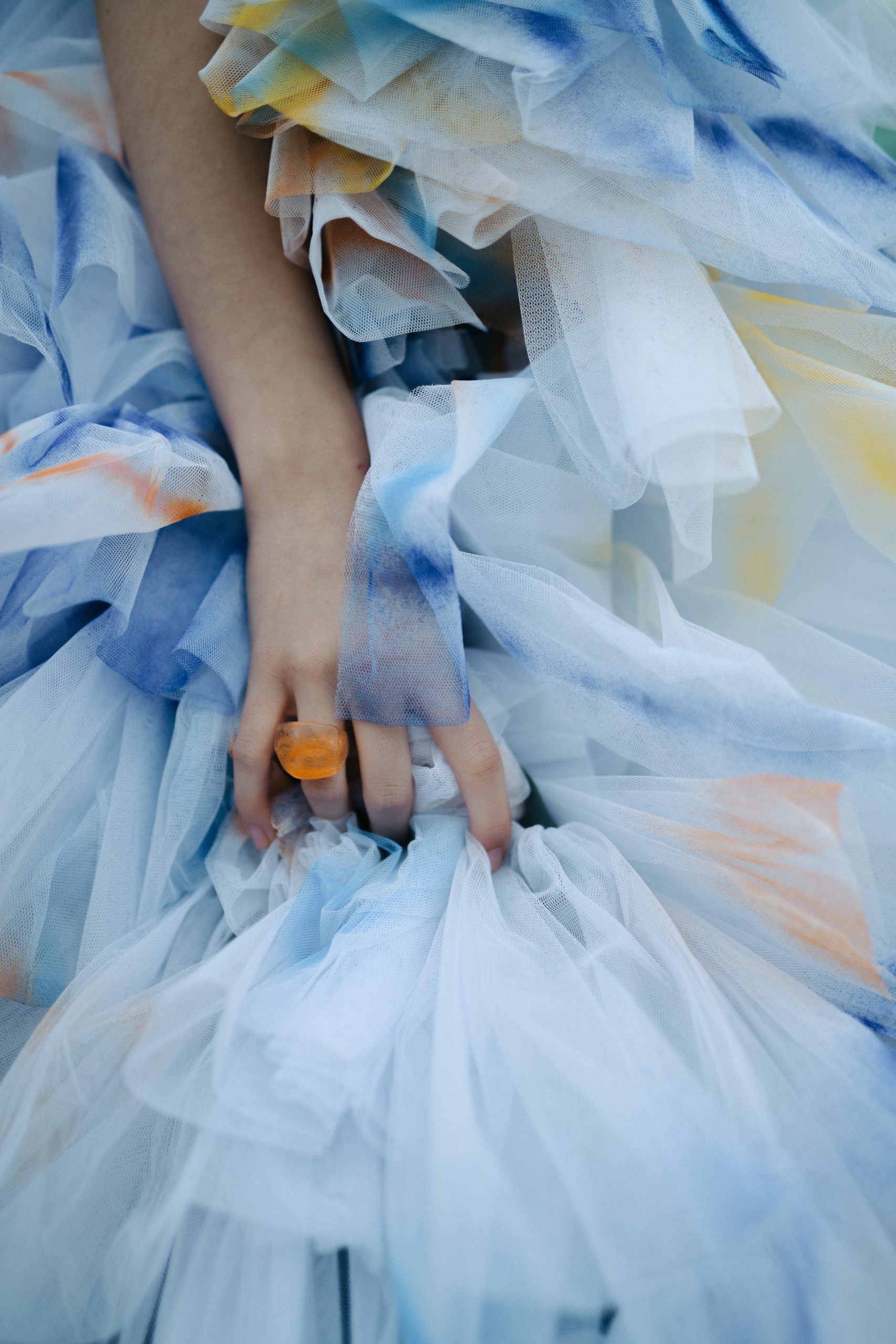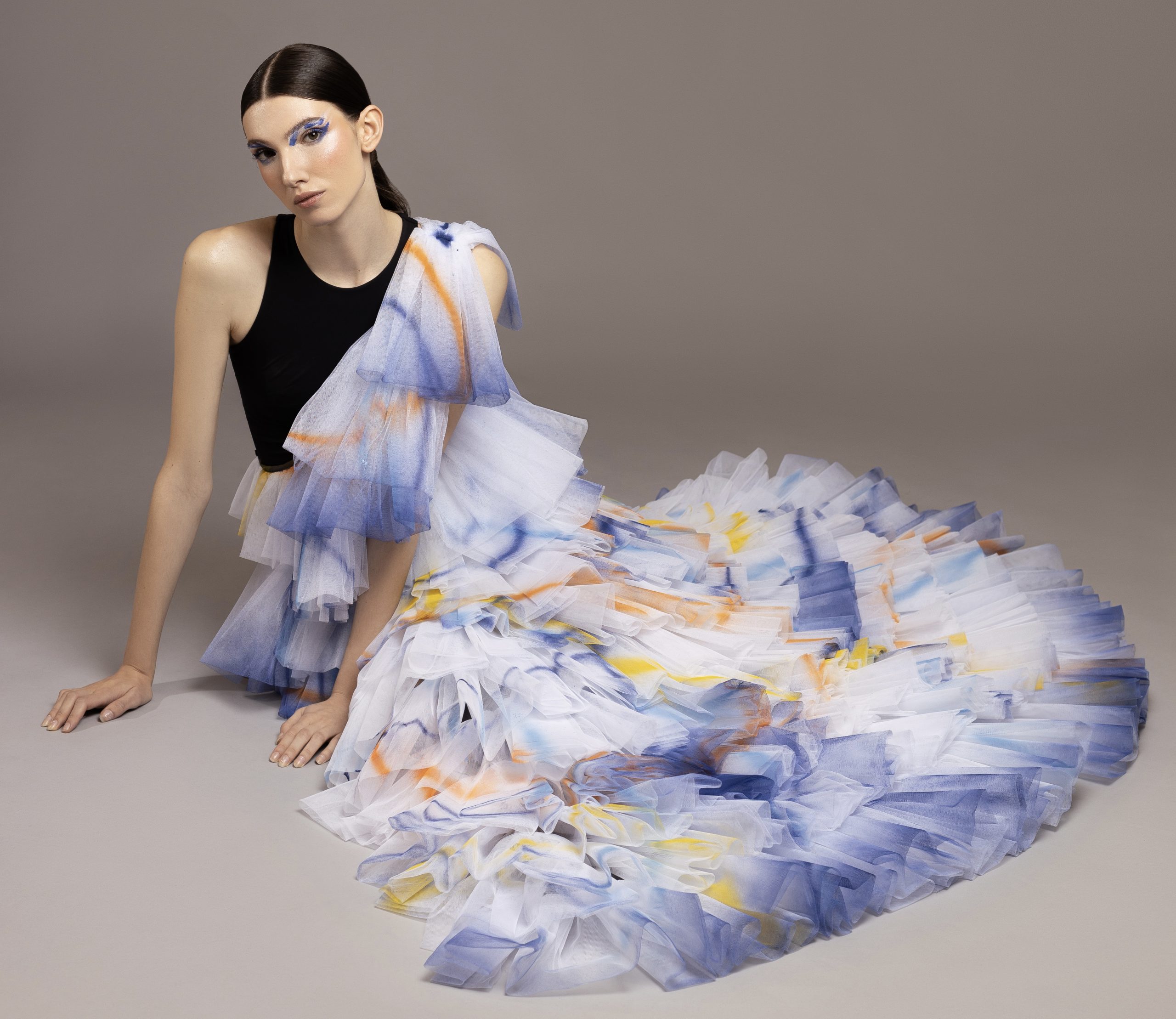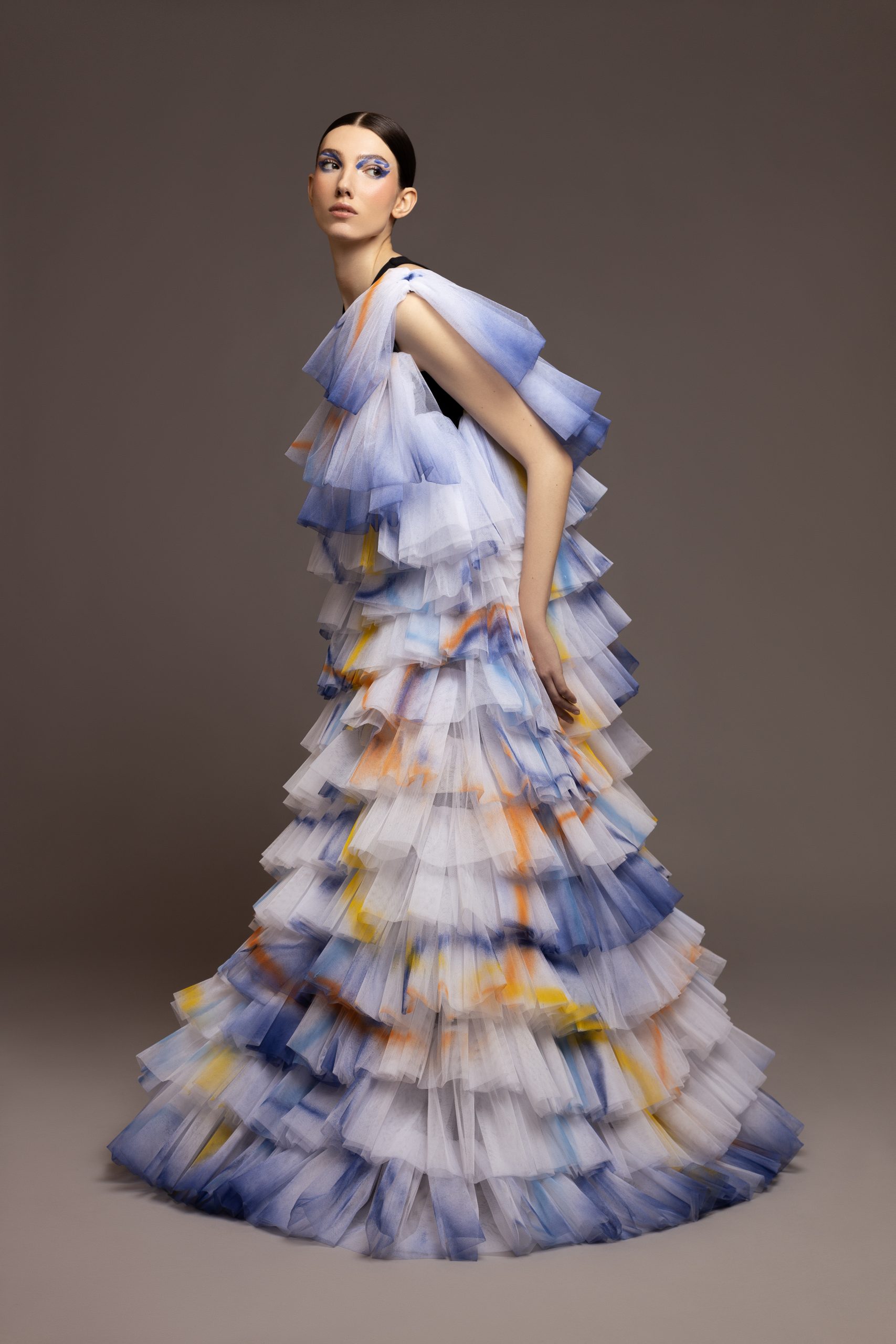 El tul, en su base blanca, ha sido transformado en un lienzo por el artista Pablo Ozo, quien lo ha intervenido con spray en una paleta vibrante de tonos azules, naranjas y amarillos. Cada brochazo de color se mueve con la fluidez del tul, aportando un dinamismo único al vestido. Esta pieza no solo destaca por su diseño vanguardista, sino también por la manera en que fusiona moda y arte, ofreciendo una experiencia visual cautivadora.