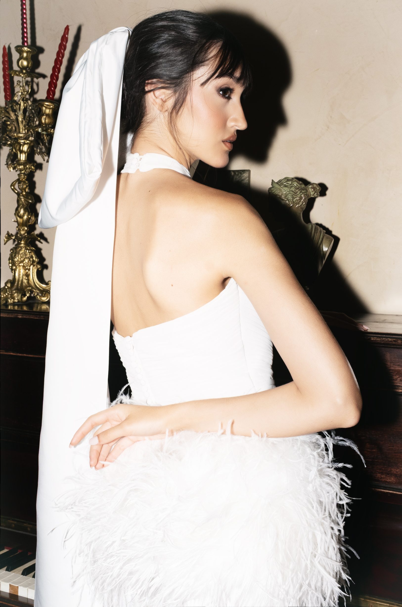 Vestido corto con el cuerpo elaborado con una fina gasa blanca plisada a mano. Escote en V y espalda semidescubierta, cerrada por una hilera de botones forrados que desciende hasta la cadera. La falda está confeccionada con numerosas capas de plumas de avestruz, creando volumen y una sensación de movimiento y ligereza a cada paso. Como complemento, un gran lazo cae desde la cabeza hasta el suelo.