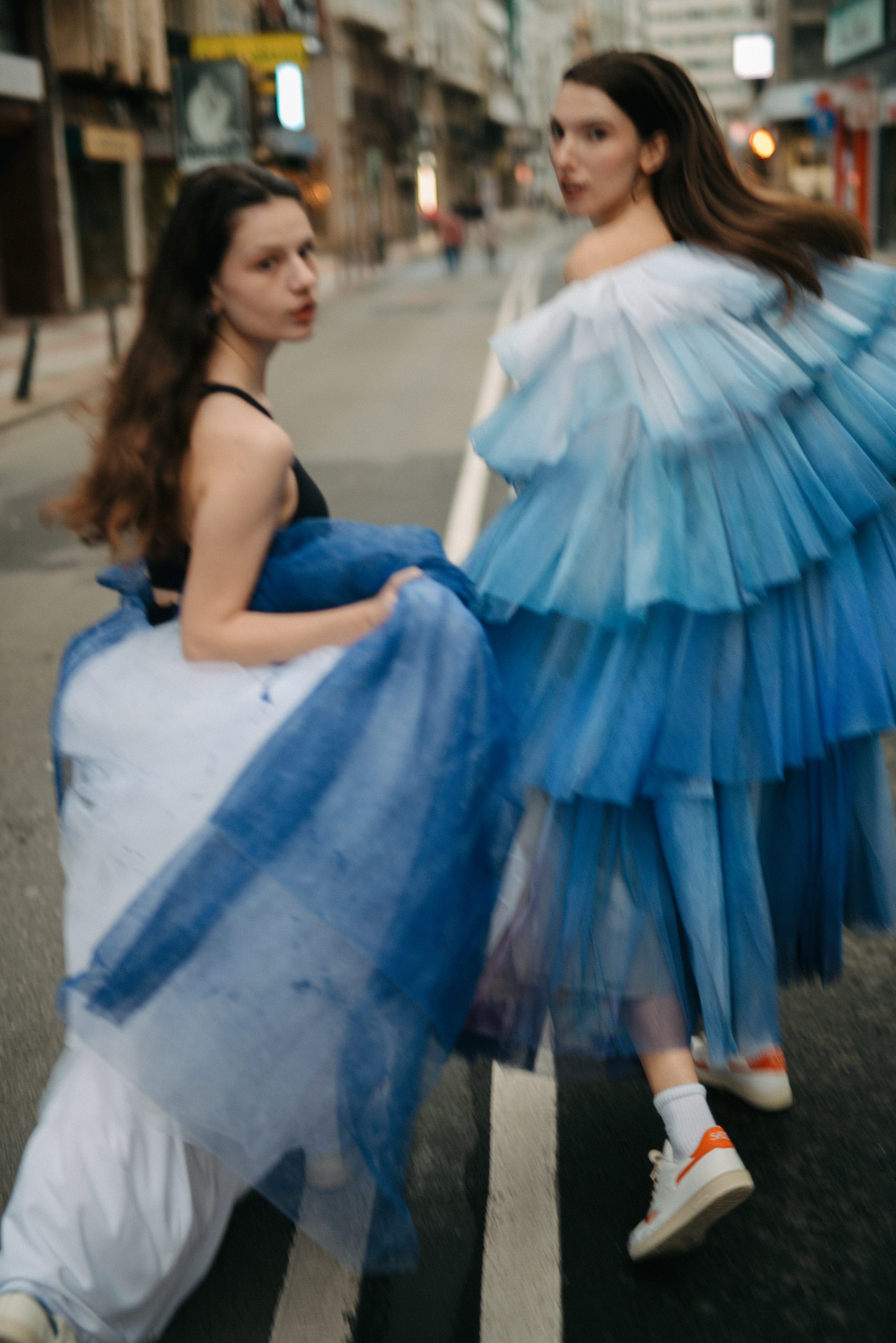 Esta falda está confeccionada en tul, la falda presenta una base blanca que se transforma en una obra de arte, salpicada de vibrantes tonalidades de azul. Las capas de tul, superpuestas de manera desordenada, crean una estructura dinámica.